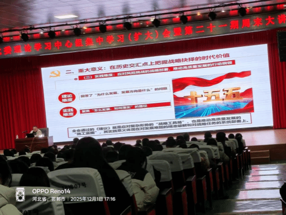 1 日,毛概教研室按照学校要求,组织全体教师参加党的二十届四中全会精神专题宣讲讲座。本次讲座特邀河北工业大学孟令择教授主讲,他以《深学笃行四中全会精神 持续推进中国式现代化发展》为题,从“十五五”时期的重要地位、重大意义、指导方针、经济社会发展原则、经济社会发展主要目标等维度系统解读了《建议》。本次讲座内容翔实、指导性强,为毛概教师将《建议》融入课程教学提供了有力支撑。